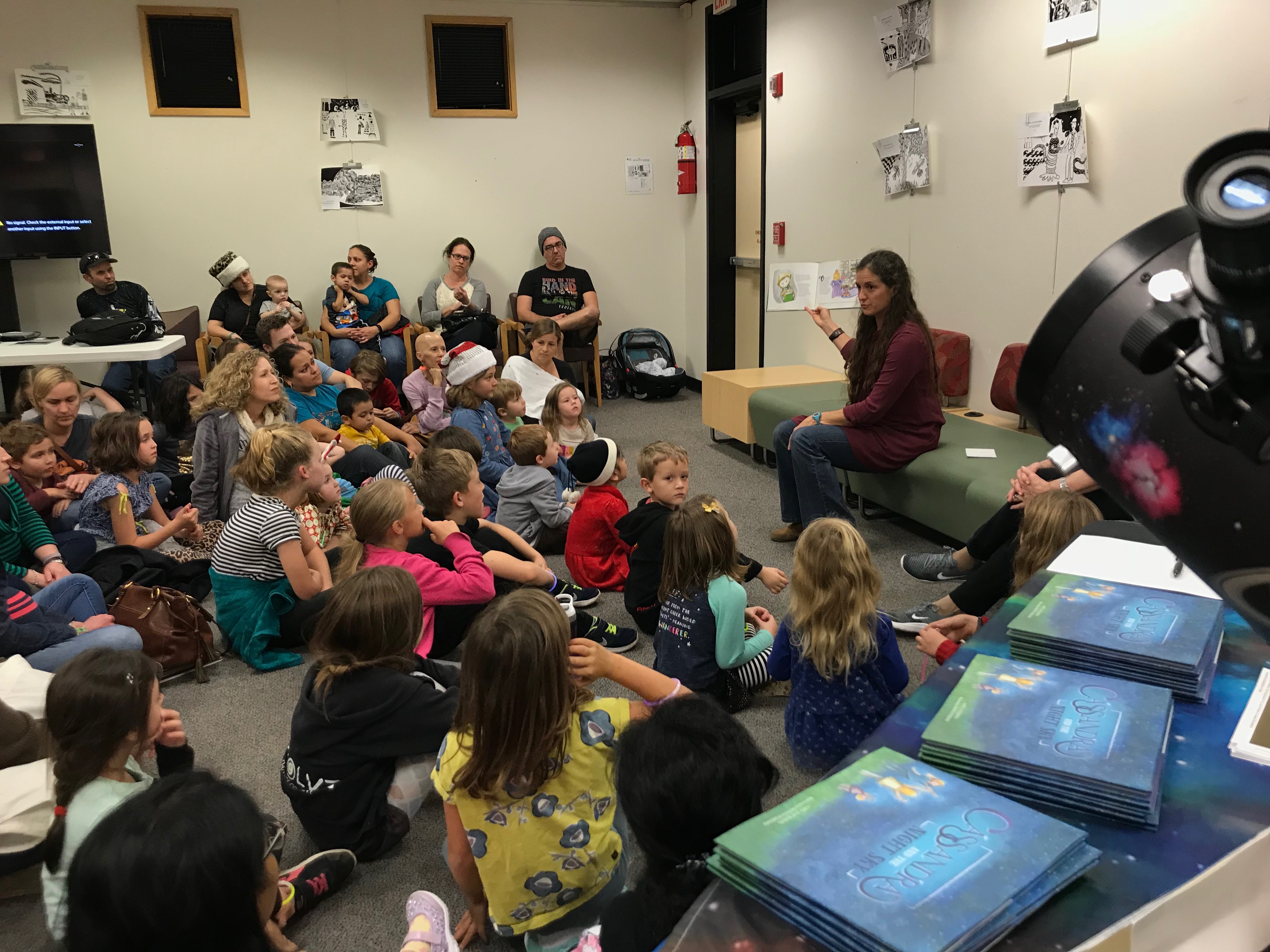 Right when everyone got quiet and I looked out on the crowd, I realized how many people were trying to fit into the room at once and listen to the story! It was the largest group of people I have ever read to! It was exciting and humbling. After we listened to the story, kids made constellation scopes out of the characters from the story. They could choose Cygnus, Cassandra (Cassiopeia), Scorpius or the Teapot (Sagittarius). I hope they are inspired to go outside at night, look up at the stars, and wonder!
