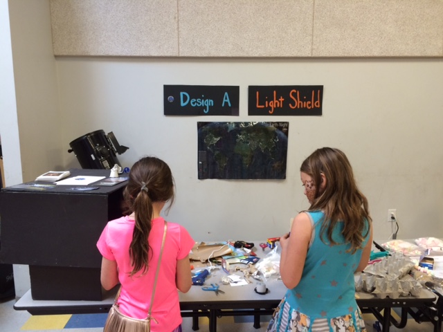 Using a lunch sack filled with two popsicle sticks, two straws, a piece of foil, two pieces of cardboard and access to tape and a glue gun, kids designed a light shield intended to shine light from glaring street lights down to the ground so we can see our beautiful night sky, make our streets safer, and save electricity.